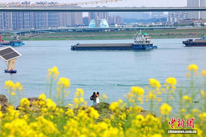 3月25日,湖北宜昌沿江二岸的油菜花田接连开放,金黄色的花海取少江碧波相应成趣,组成1幅靓丽的秋日绘卷。没有少市平易近、搭客信步正在宜昌市面军区江边,摄影纪念,感触感染秋日气呼呼息。图为油菜花田为秋日绘卷加了1擦温黄。董晓斌 摄